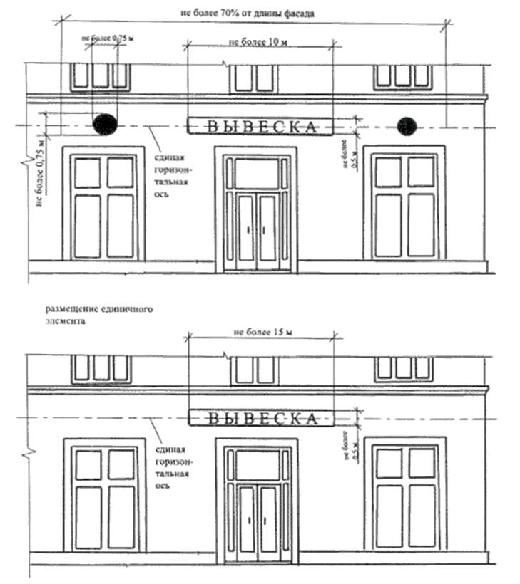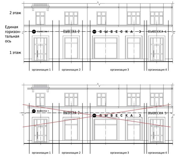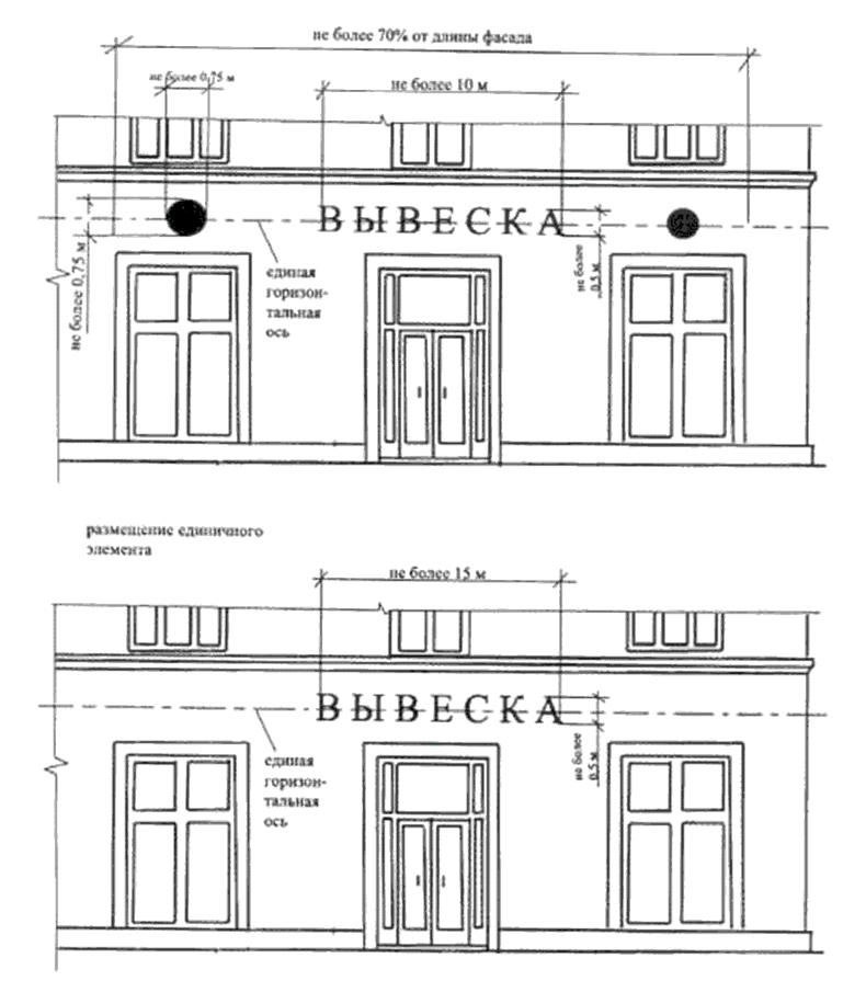 При размещении на одном фасаде объекта одновременно вывесок нескольких организаций указанные вывески располагаются в один высотный ряд на единой горизонтальной линии — на одном уровне и высоте.