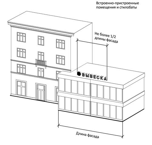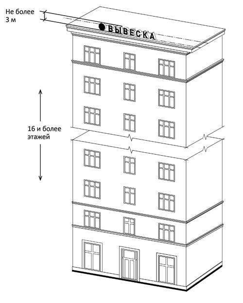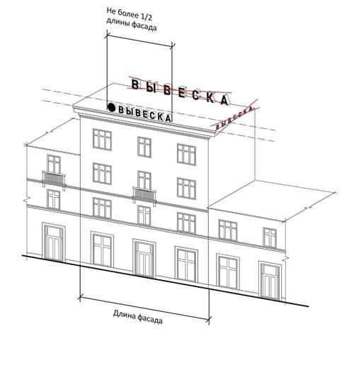 На крыше одного объекта может быть размещена только одна рекламная или информационная конструкция. Конструкция вывесок, допускаемых к размещению на крышах зданий представляют собой объемные символы, которые могут быть оборудованы исключительно внутренним подсветом. Длина вывесок, устанавливаемых на крыше объекта, не может превышать половину длины фасада, по отношению к которому они размещены.