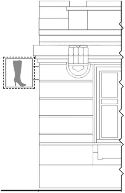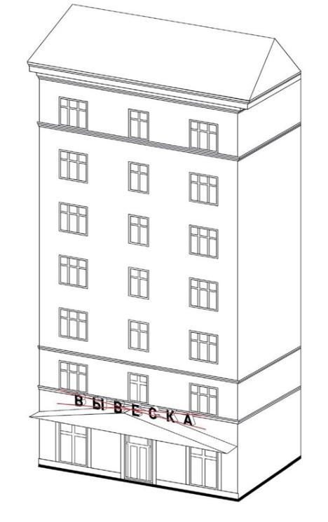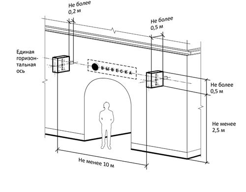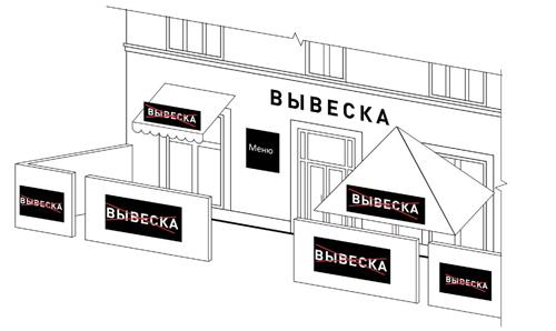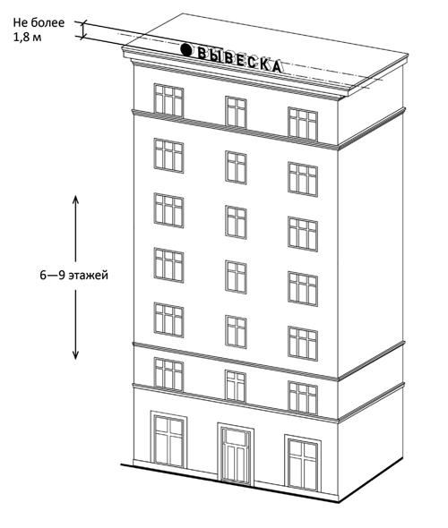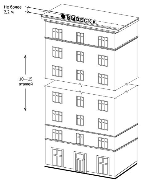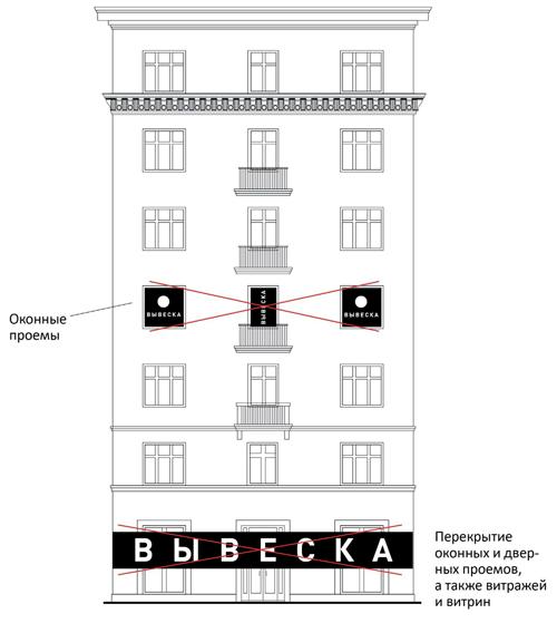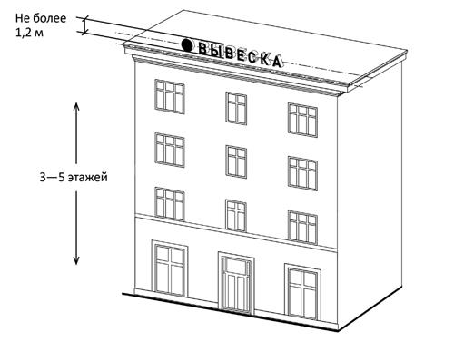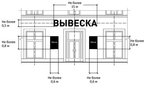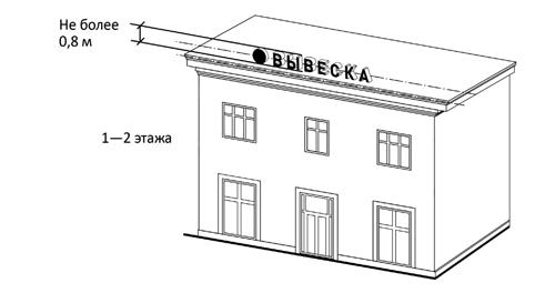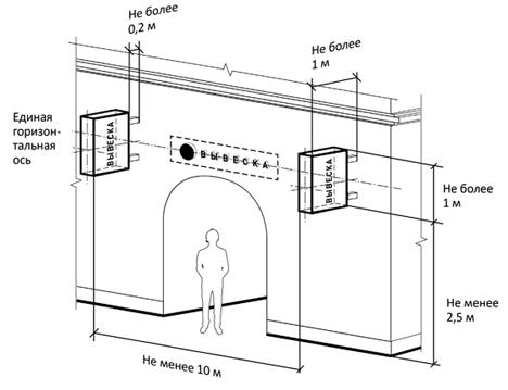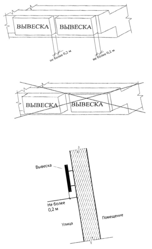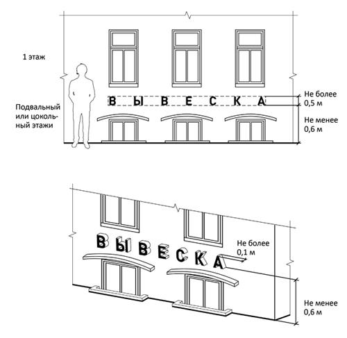 Вывески могут быть размещены над окнами подвального или цокольного этажа, но не ниже 0,60 м от уровня земли до нижнего края настенной конструкции. При этом вывеска не должна выступать от плоскости фасада более чем на 0,10 м.