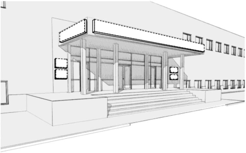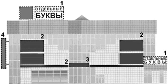 На фасаде объекта козырька настенная конструкция может быть размещена на фризе козырька, строго в габаритах указанного фриза.