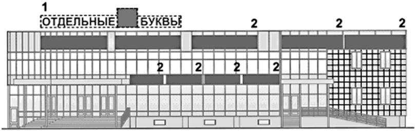 При размещении настенной конструкции в пределах 70% от длины фасада в виде комплекса идентичных взаимосвязанных элементов (информационное поле (текстовая часть) и декоративно-художественные элементы) максимальный размер каждого из указанных элементов не может превышать 10м в длину.