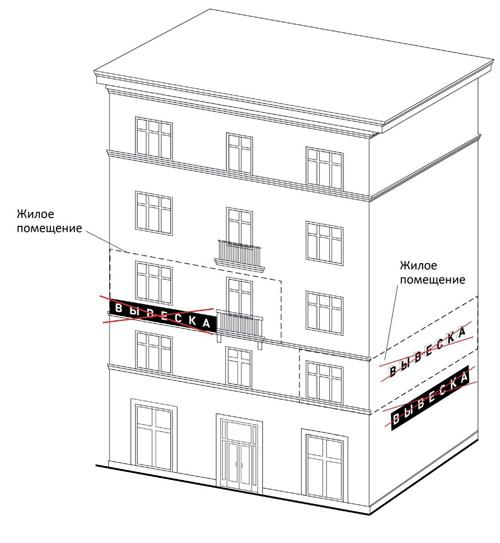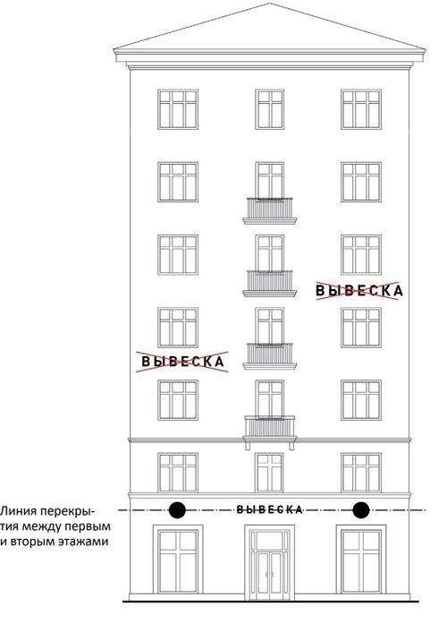 Вывески необходимо размещать на плоских участках фасада, свободных от архитектурных элементов, исключительно в пределах площади внешних поверхностей объекта, соответствующей физическим размерам занимаемых данными организациями помещений.