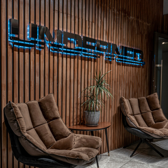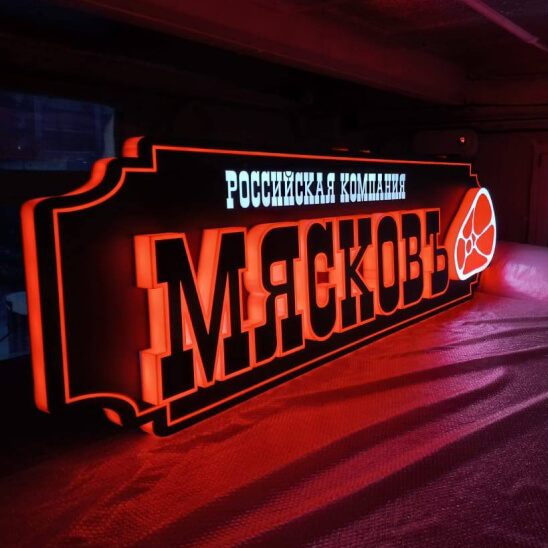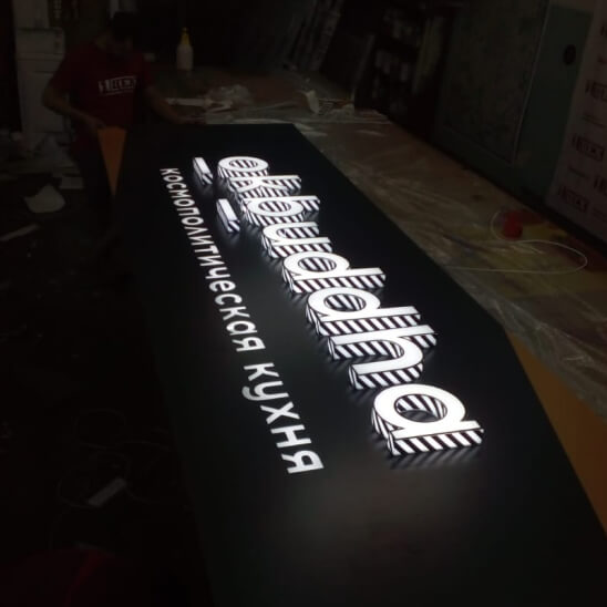 Задник объемных букв с контражуром равномерно рассеивает свет по подложке или стене. Устанавливают такую вывеску на определенном расстоянии от фона, чтобы создать эффект контурной подсветки.
